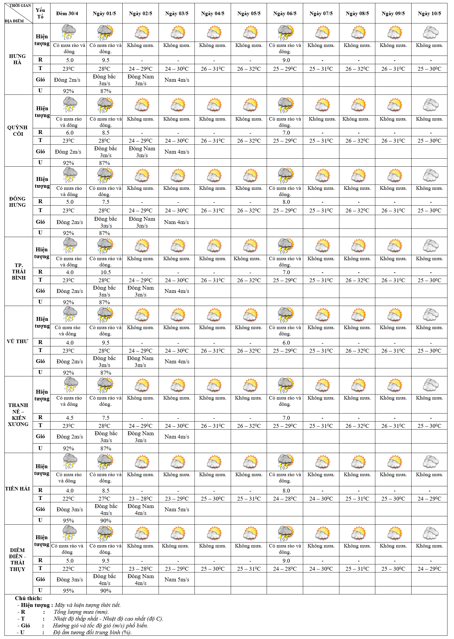 DỰ BÁO THỜI TIẾT ĐIỂM 10 NGÀY KHU VỰC THÁI BÌNH TỪ ĐÊM 30/4 – 10/5/2025