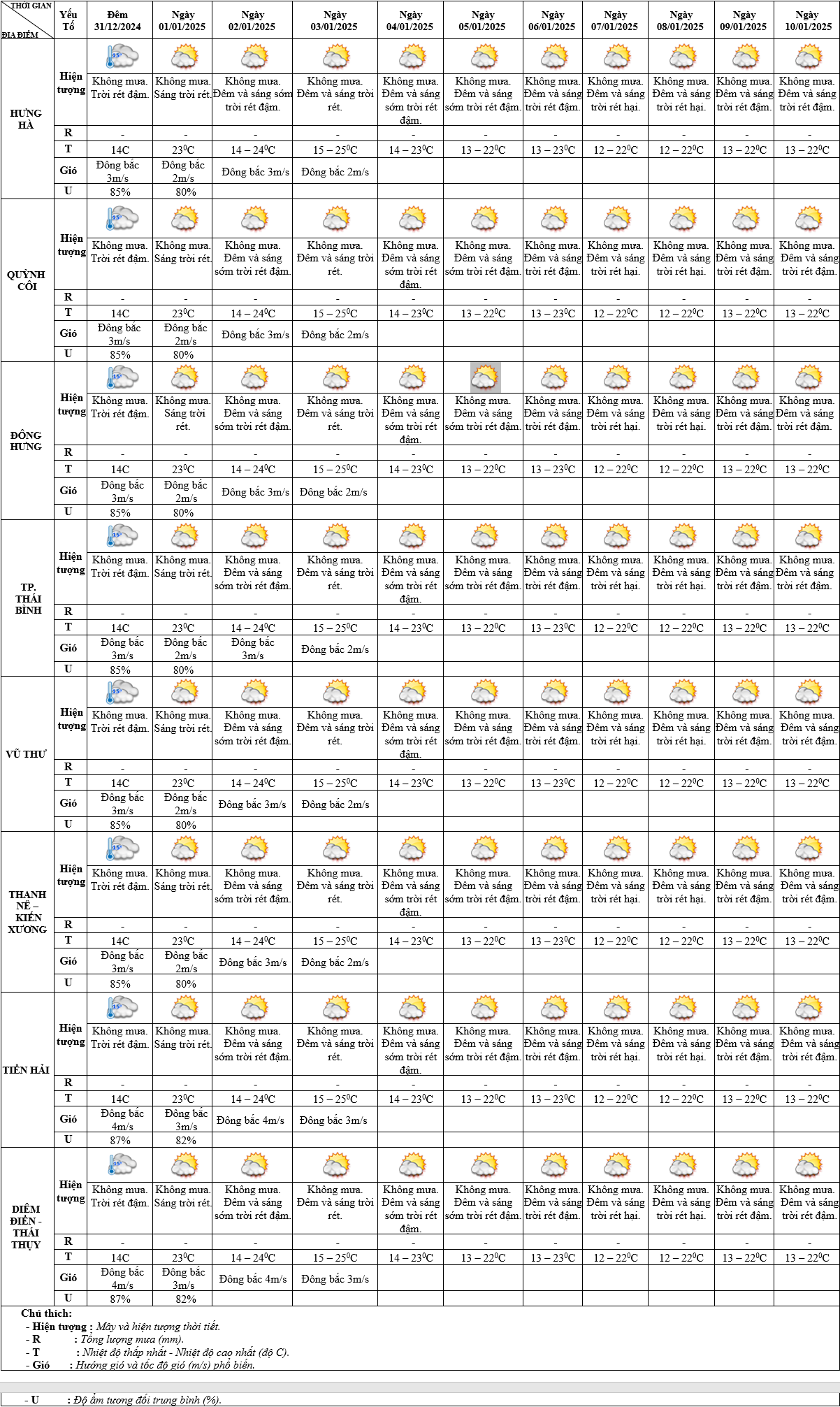 DỰ BÁO THỜI TIẾT ĐIỂM 10 NGÀY KHU VỰC THÁI BÌNH TỪ ĐÊM 31/12/2024 – 10/01/2025