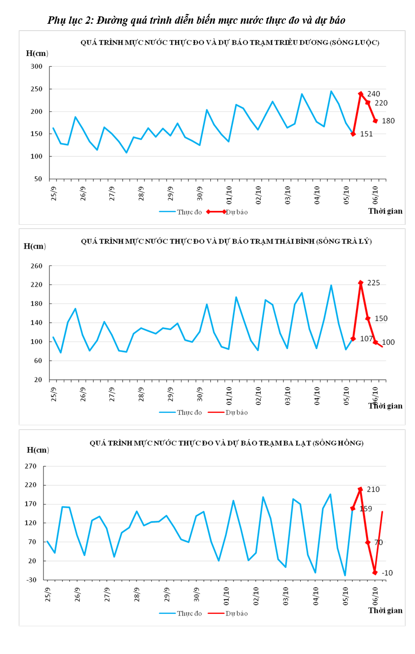 - Mực nước trên sông Trà Lý, Hồng, Luộc tiếp tục dao động theo thủy triều, điều tiết hồ thủy điện: biến đổi chậm.