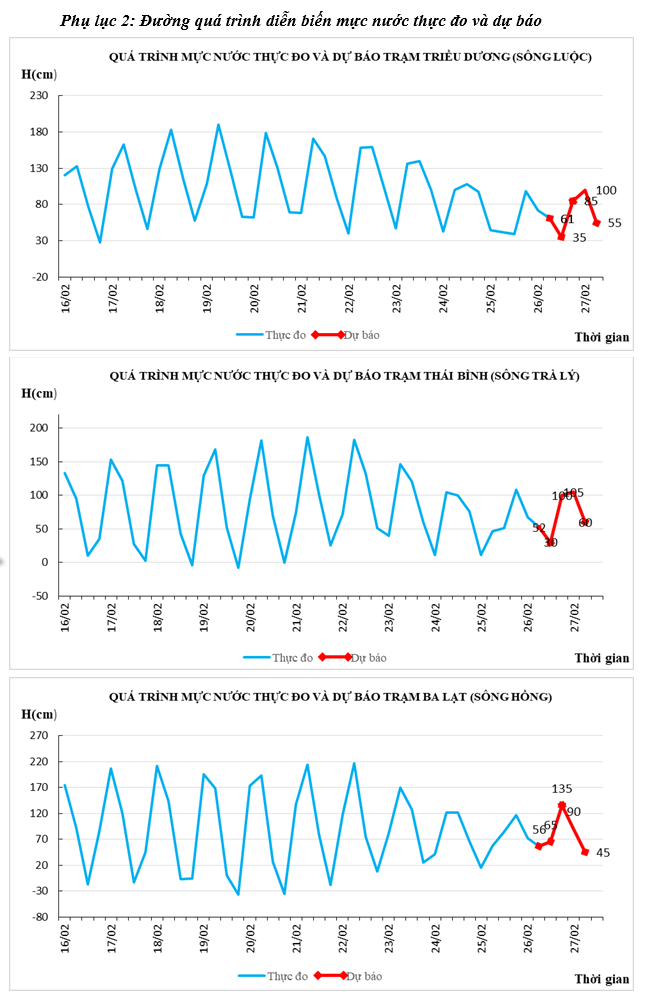 - Mực nước trên các sông Trà Lý, sông Hồng, sông Luộc tiếp tục biến đổi chậm và chịu ảnh hưởng của thủy triều, điều tiết hồ thủy điện.