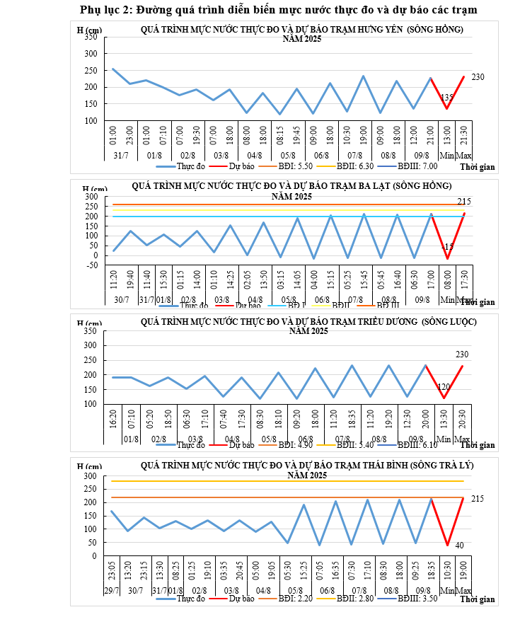 - Khả năng xuất hiện các hiện tượng thủy văn nguy hiểm trong thời hạn dự báo: Ngày 10/8 mực nước đỉnh triều trạm Ba Lạt có khả năng đạt trên mức báo động I.