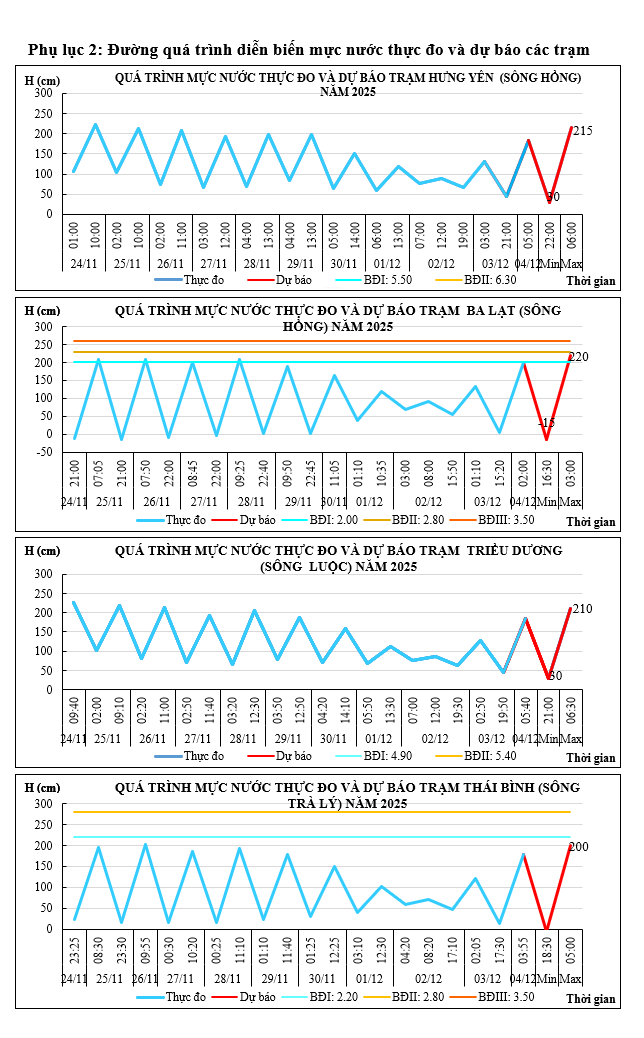 - Khả năng xuất hiện các hiện tượng thủy văn nguy hiểm trong thời hạn dự báo: Trong khoảng 24h tới, mực nước đỉnh triều trạm Ba Lạt có khả năng ở mức trên báo động I.