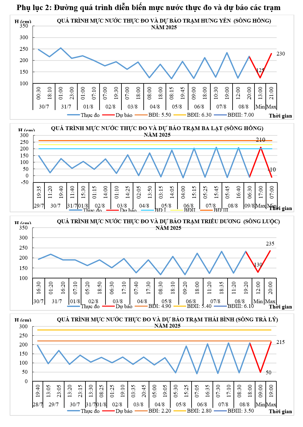 - Khả năng xuất hiện các hiện tượng thủy văn nguy hiểm trong thời hạn dự báo: Ngày 09/8 mực nước đỉnh triều trạm Ba Lạt có khả năng đạt trên mức báo động I.
