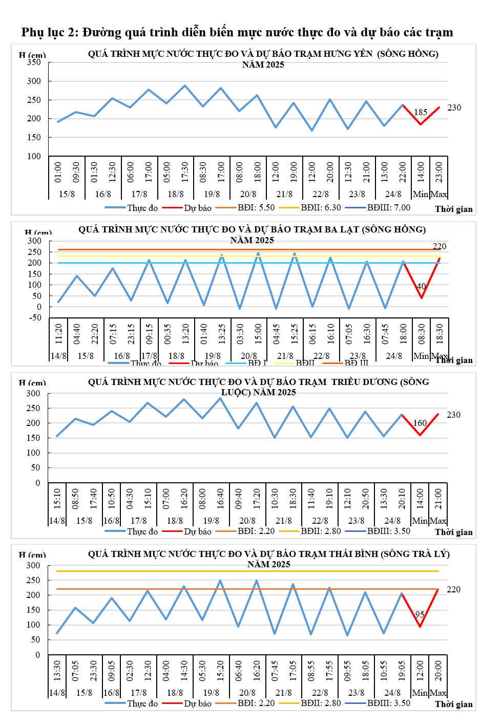 - Khả năng xuất hiện các hiện tượng thủy văn nguy hiểm trong thời hạn dự báo: Ngày 25/8 mực nước đỉnh triều trạm Thái Bình, Đông Quý, Ba Lạt có khả năng ở mức báo động I-II, có khả năng xuất hiện ngập lụt cục bộ tại một số tuyến phố trên địa bàn các phường Trần Hưng Đạo, Trần Lãm,...