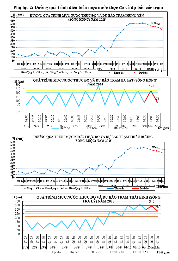 Mực nước trên các sông Hồng, sông Luộc và sông Trà Lý dao động theo thủy triều, điều tiết hồ thủy điện (Hồ Tuyên Quang duy trì 03 cửa xả đáy, Thác Bà duy trì 03 cửa xả mặt, Hồ Sơn La mở 01 cửa xả đáy): Mực nước các trạm xuống chậm.