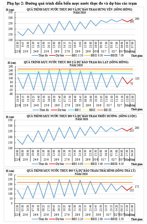 - Mực nước trên các sông Hồng, sông Luộc và sông Trà Lý chịu ảnh hưởng của thủy triều, điều tiết hồ thủy điện và mưa: xu thế xuống.