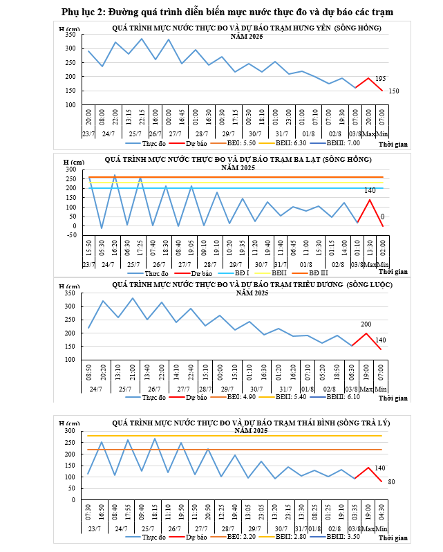 - Mực nước trên các sông Hồng, sông Luộc và sông Trà Lý chịu ảnh hưởng của thủy triều và điều tiết của các hồ thủy điện: xu thế lên.