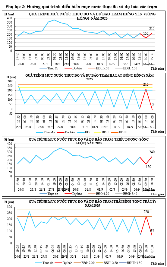 - Khả năng xuất hiện các hiện tượng thủy văn nguy hiểm trong thời hạn dự báo: Ngày 05/9 mực nước đỉnh triều trạm Ba Lạt, Thái Bình có khả năng đạt mức báo động I.