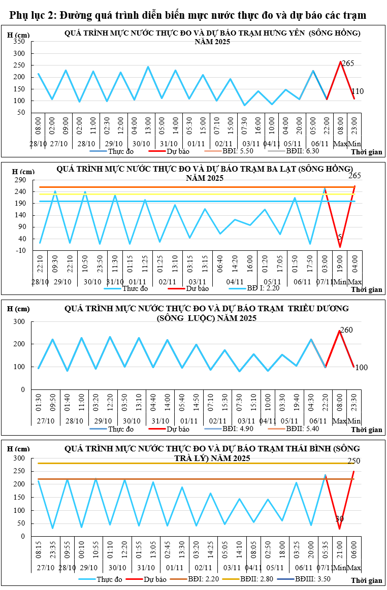 Mực nước trên các sông Hồng, sông Luộc và sông Trà Lý dao động theo thủy triều và điều tiết hồ thủy điện (Hồ Hòa Bình mở 01 cửa xả đáy lúc 17h00 ngày 06/11; Hồ Tuyên Quang, Thác Bà duy trì 01 cửa xả): Xu thế lên.