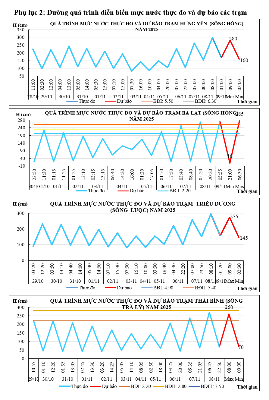 Mực nước trên các sông Hồng, sông Luộc và sông Trà Lý dao động theo thủy triều và điều tiết hồ thủy điện (Hồ Tuyên Quang duy trì 01 cửa xả đáy, Thác Bà duy trì 01 cửa xả mặt): Xu thế lên.