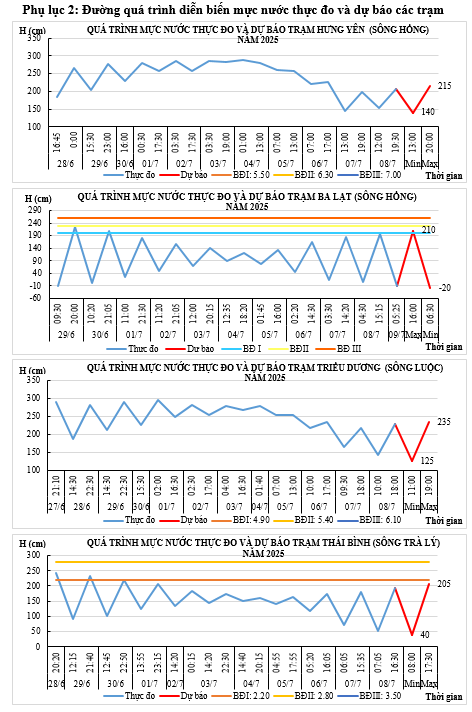 - Mực nước trên các sông Hồng, sông Luộc và sông Trà Lý chịu ảnh hưởng của thủy triều và điều tiết hồ thủy điện: xu thế lên.