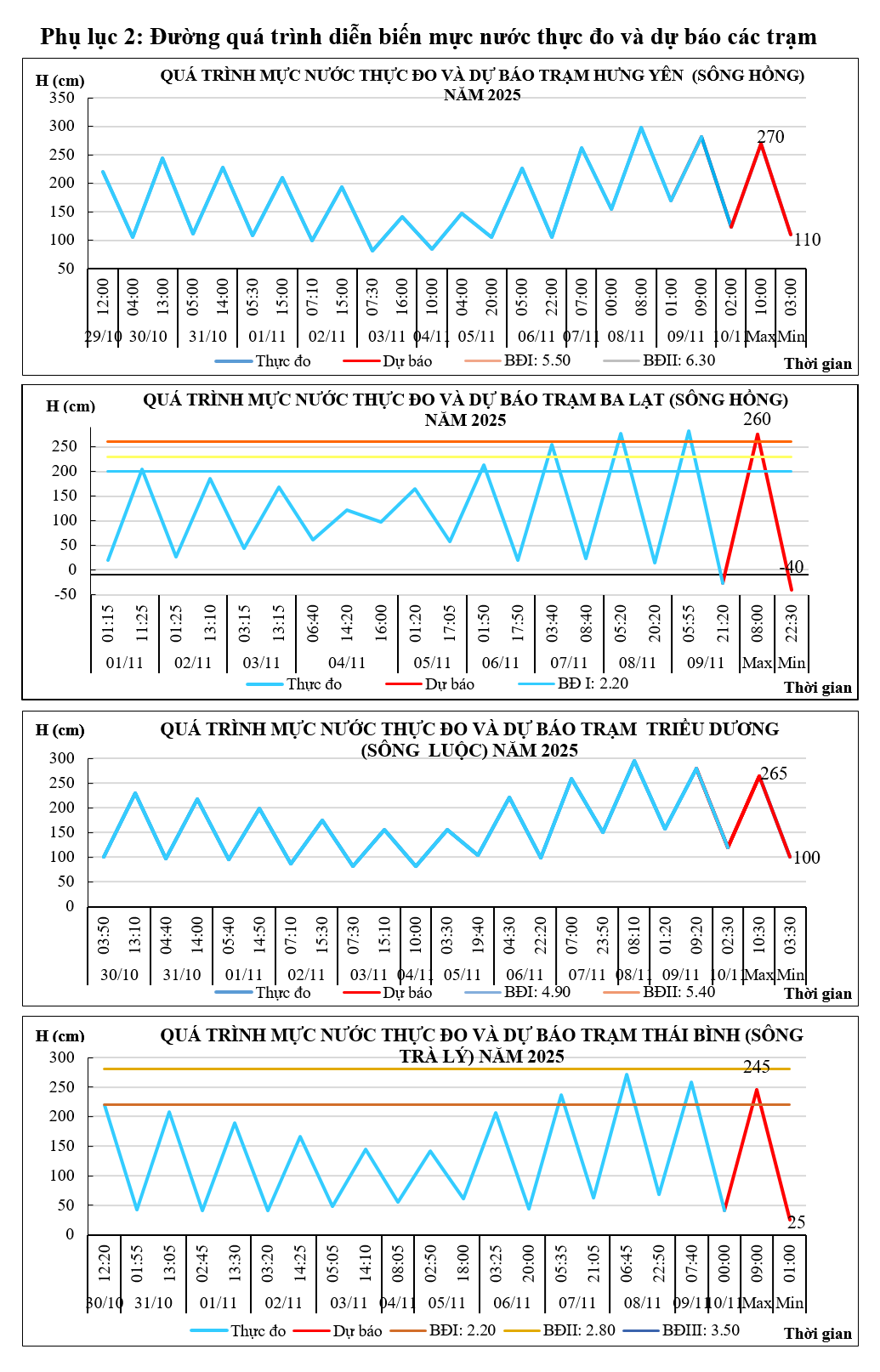 Mực nước trên các sông Hồng, sông Luộc và sông Trà Lý dao động theo thủy triều và điều tiết hồ thủy điện (Hồ Hòa Bình, Tuyên Quang duy trì 01 cửa xả đáy, Thác Bà duy trì 01 cửa xả mặt): Xu thế xuống.