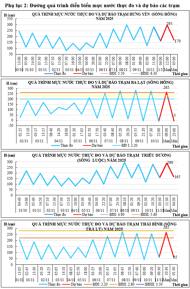 Mực nước trên các sông Hồng, sông Luộc và sông Trà Lý dao động theo thủy triều và điều tiết hồ thủy điện (Hồ Hòa Bình duy trì 01 cửa xả đáy, Thác Bà duy trì 02 cửa xả mặt): biến đổi chậm.