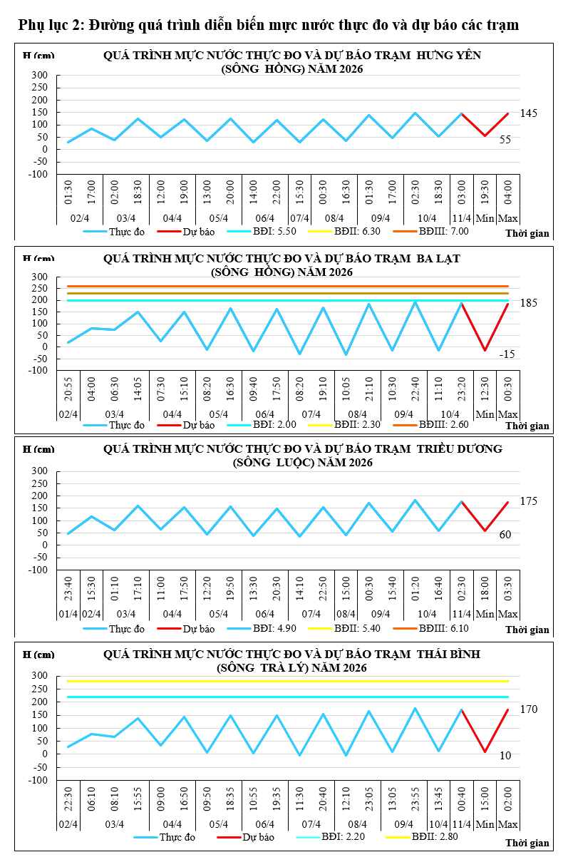 - Mực nước trên các sông Hồng, sông Luộc và sông Trà Lý chịu ảnh hưởng của thủy triều và điều tiết của các hồ thủy điện: Biến đổi chậm.
