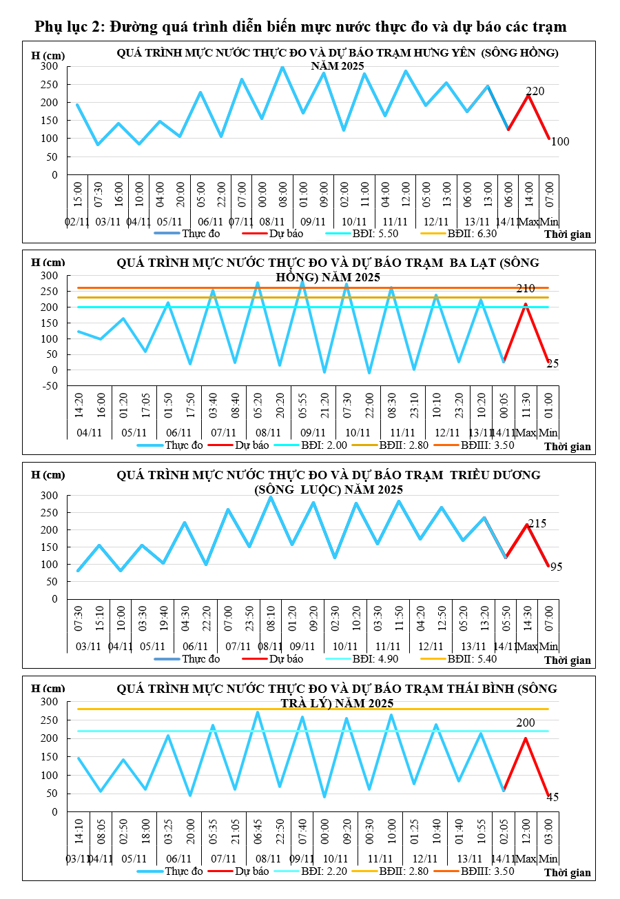 Mực nước trên các sông Hồng, sông Luộc và sông Trà Lý dao động theo thủy triều và điều tiết hồ thủy điện (Hồ Thác Bà duy trì 01 cửa xả mặt): xu thế xuống.