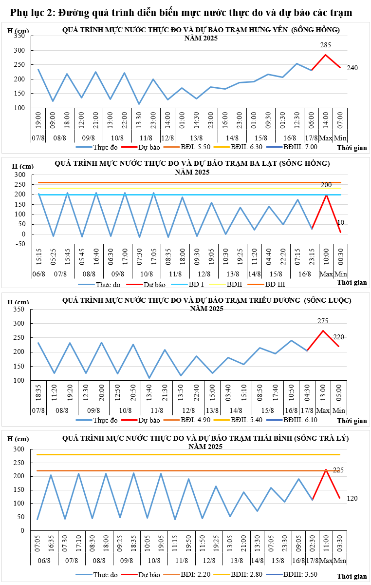 - Mực nước trên các sông Hồng, sông Luộc và sông Trà Lý chịu ảnh hưởng của thủy triều và điều tiết của các hồ thủy điện: Xu thế lên.