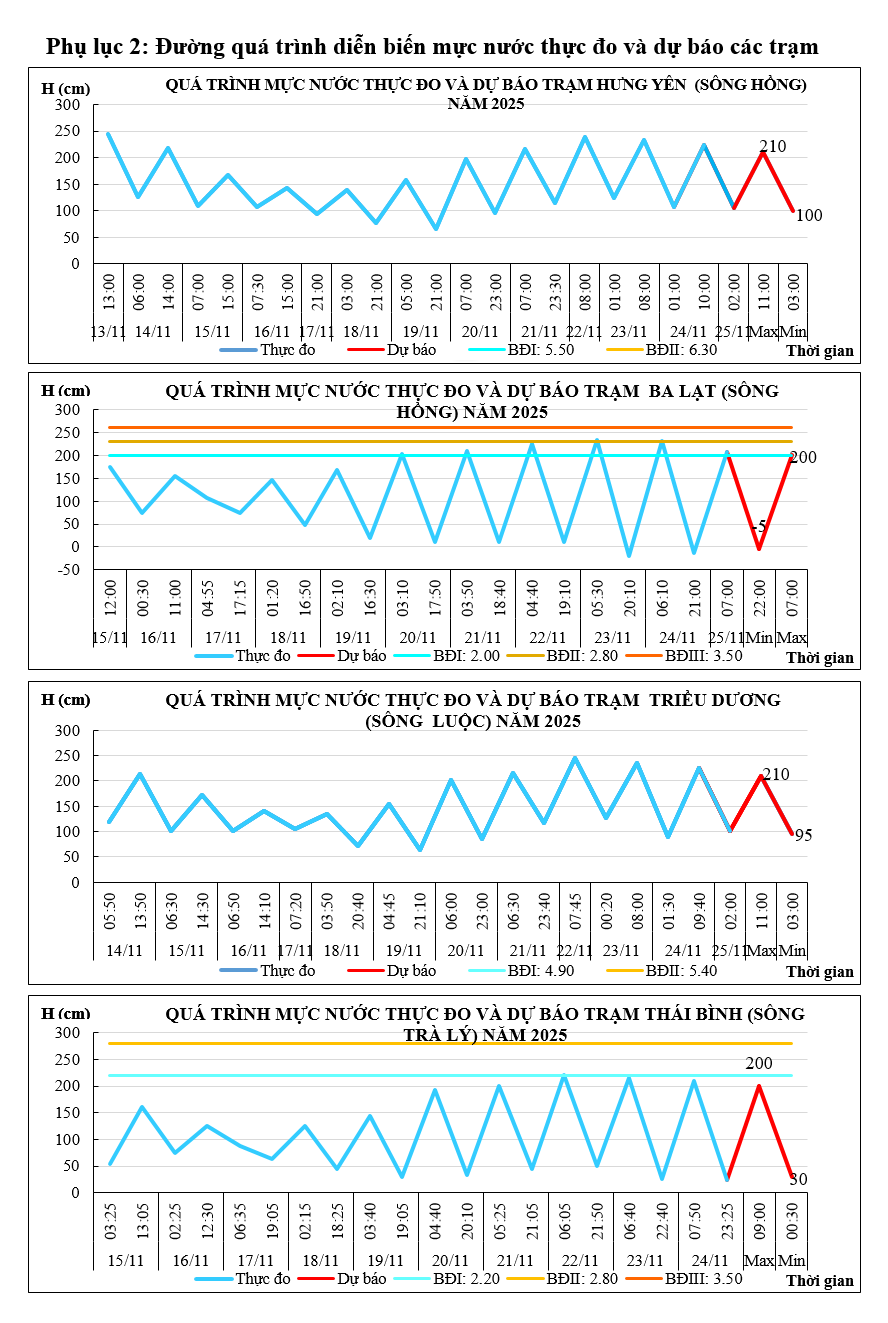 Mực nước trên các sông Hồng, sông Luộc và sông Trà Lý dao động theo thủy triều và điều tiết hồ thủy điện (Hồ Hòa Bình đóng 01 cửa xả đáy lúc 21h00 ngày 24/11): Xu thế xuống.