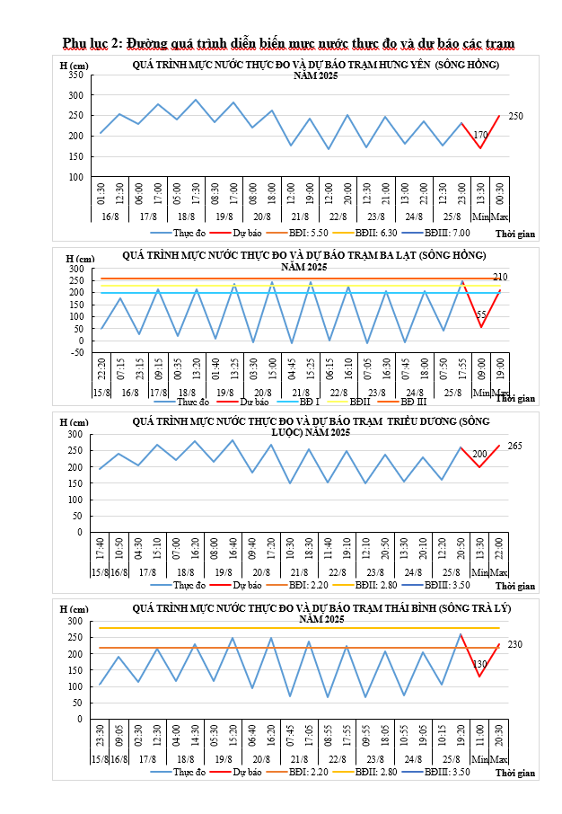 Mực nước trên các sông Hồng, sông Luộc và sông Trà Lý dao động theo thủy triều, điều tiết hồ thủy điện và mưa lớn: xu thế lên (các trạm có nước dâng do bão 0.3-0.5m).