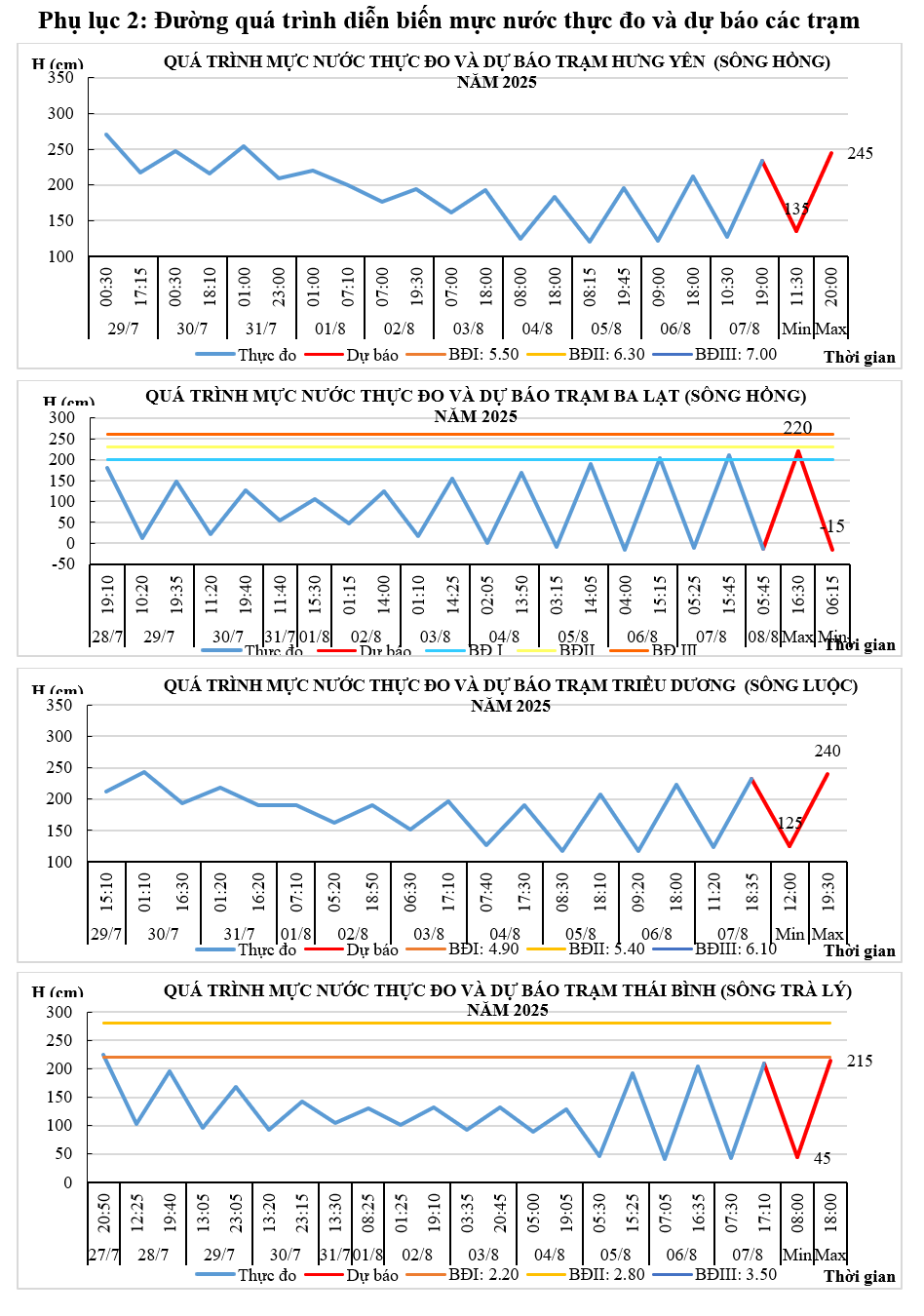 - Khả năng xuất hiện các hiện tượng thủy văn nguy hiểm trong thời hạn dự báo: Ngày 08/8 mực nước đỉnh triều trạm Ba Lạt có khả năng đạt trên mức báo động I.