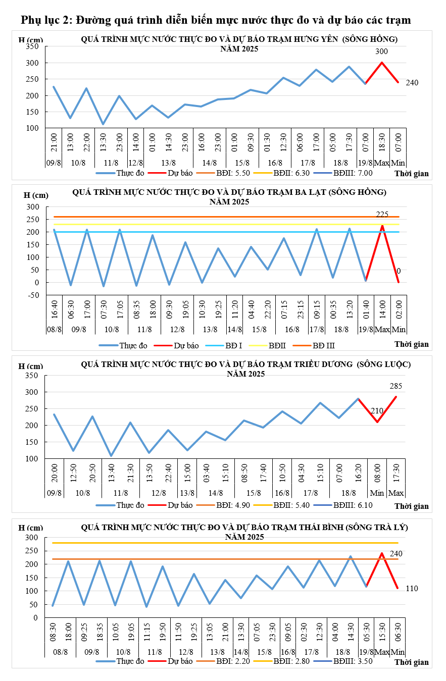 - Khả năng xuất hiện các hiện tượng thủy văn nguy hiểm trong thời hạn dự báo: Ngày 19/8 mực nước đỉnh triều trạm Thái Bình, Ba Lạt có khả năng ở mức báo động I-II.