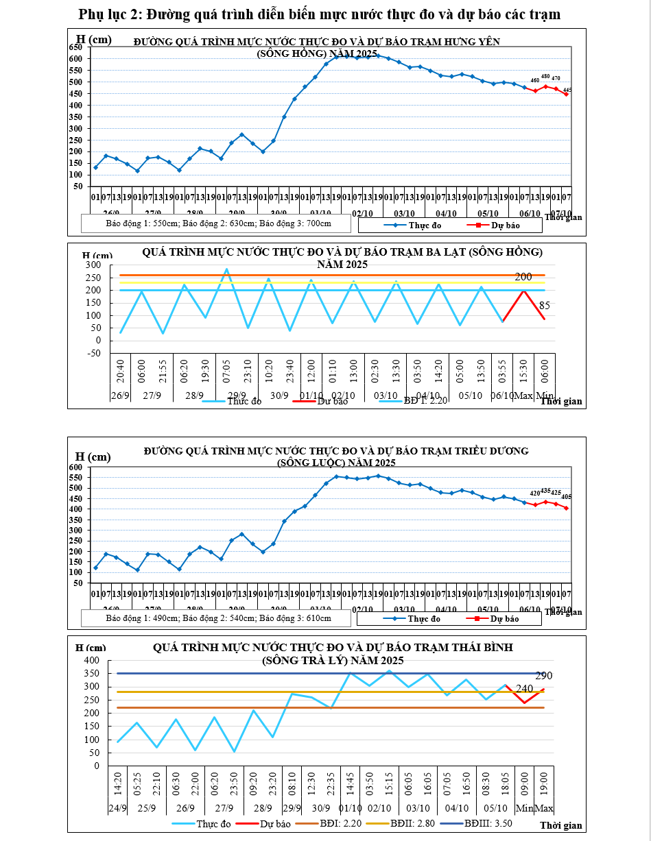 - Khả năng xuất hiện các hiện tượng thủy văn nguy hiểm trong thời hạn dự báo: Trong 24h tới mực nước các trạm vẫn ở mức cao; mực nước các trạm Quyết Chiến, Thái Bình cao hơn báo động II, trạm Ba Lạt ở mức báo động I; trạm Hưng Yên, Triều Dương, Tiến Đức thấp hơn báo động I.
