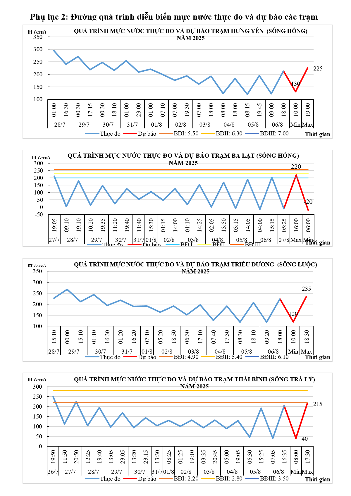 - Khả năng xuất hiện các hiện tượng thủy văn nguy hiểm trong thời hạn dự báo: Ngày 07/8 mực nước đỉnh triều trạm Ba Lạt có khả năng đạt trên mức báo động I.
