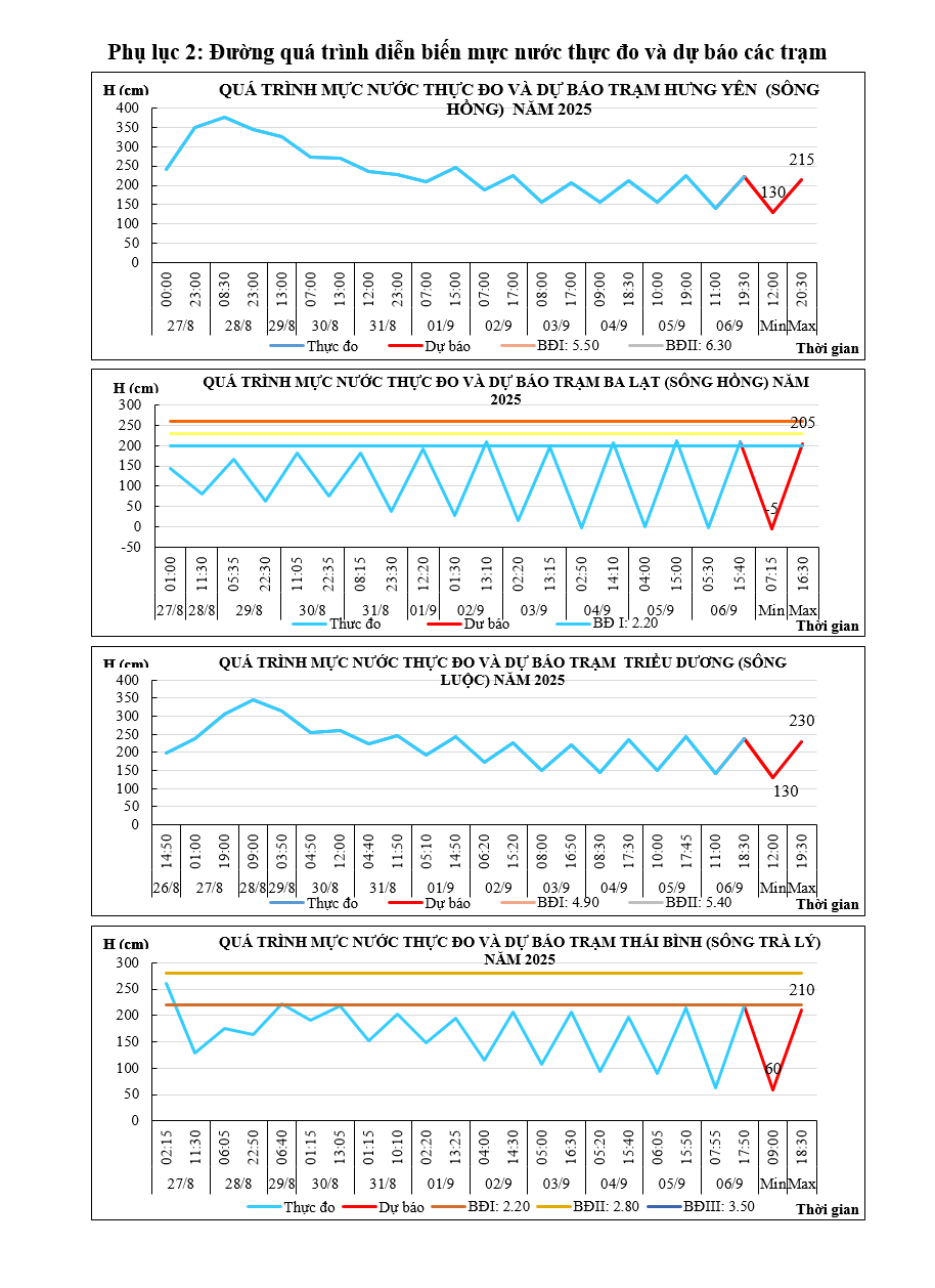 - Khả năng xuất hiện các hiện tượng thủy văn nguy hiểm trong thời hạn dự báo: Ngày 07/9 mực nước đỉnh triều trạm Ba Lạt có khả năng đạt mức báo động I.