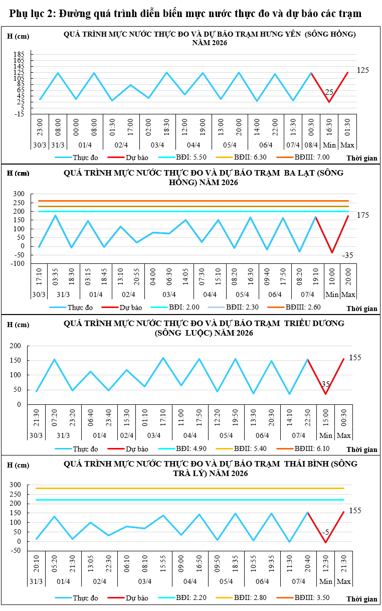 - Mực nước trên các sông Hồng, sông Luộc và sông Trà Lý chịu ảnh hưởng của thủy triều và điều tiết của các hồ thủy điện: Biến đổi chậm.