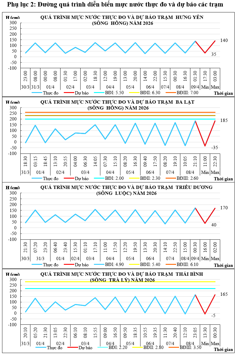 - Mực nước trên các sông Hồng, sông Luộc và sông Trà Lý chịu ảnh hưởng của thủy triều và điều tiết của các hồ thủy điện: Ít thay đổi.