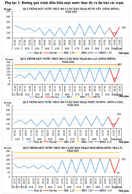 - Khả năng xuất hiện các hiện tượng thủy văn nguy hiểm trong thời hạn dự báo: Ngày 11/8 mực nước đỉnh triều trạm Ba Lạt có khả năng đạt trên mức báo động I.