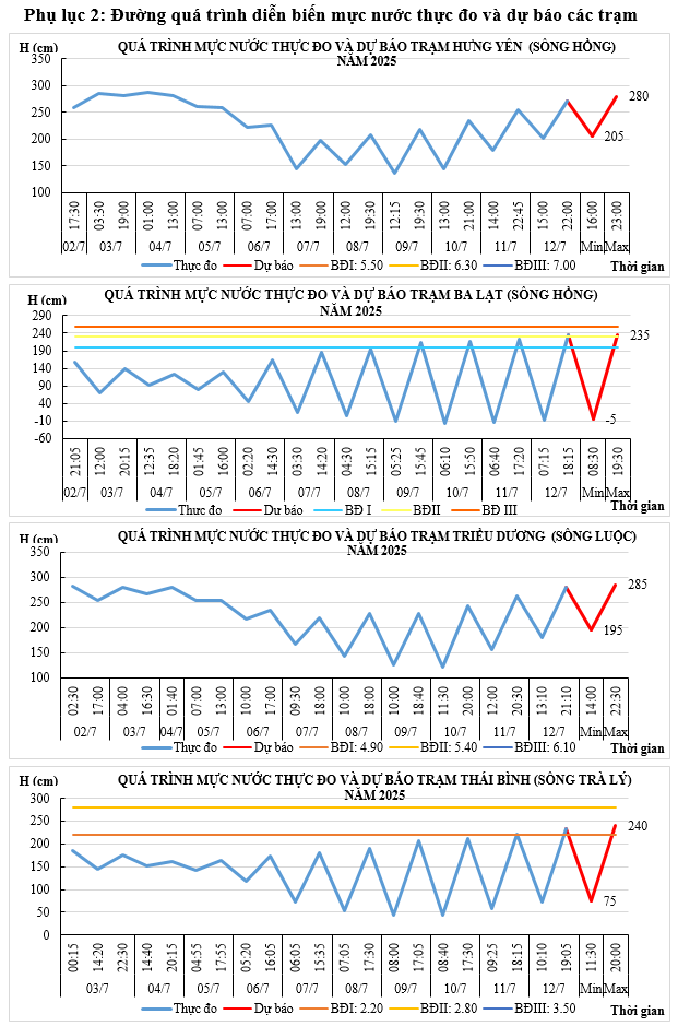 - Khả năng xuất hiện các hiện tượng thủy văn nguy hiểm trong thời hạn dự báo: Ngày 13/7 mực nước đỉnh triều trạm Đông Quý, Thái Bình, Ba Lạt có khả năng ở mức báo động I-II.