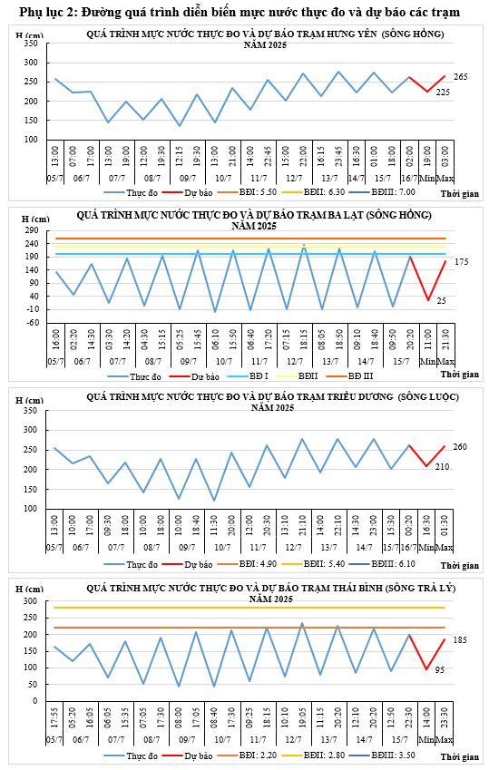 Mực nước trên các sông Hồng, sông Luộc và sông Trà Lý dao động theo thủy triều và điều tiết hồ thủy điện (Hồ Hoà Bình duy trì 02 cửa xả đáy, hồ Tuyên Quang duy trì 01 cửa xả): biến đổi chậm.