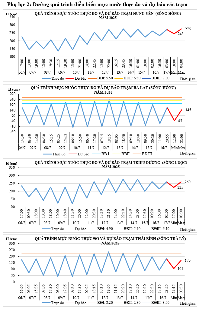 Mực nước trên các sông Hồng, sông Luộc và sông Trà Lý dao động theo thủy triều và điều tiết hồ thủy điện (Hồ Hoà Bình duy trì 02 cửa xả đáy, hồ Tuyên Quang duy trì 01 cửa xả đáy): biến đổi chậm.