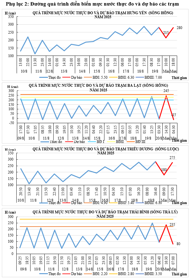 Mực nước trên các sông Hồng, sông Luộc và sông Trà Lý dao động theo thủy triều, điều tiết hồ thủy điện (Hồ Hoà Bình đóng cửa xả số 01 lúc 18h00 ngày 19/8): biến đổi chậm xu thế lên.