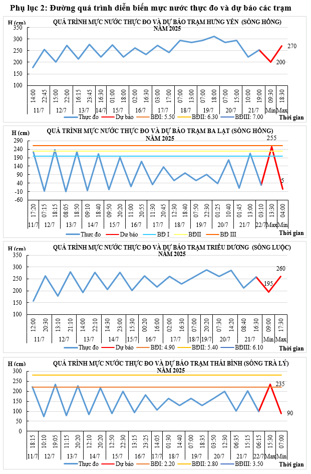 - Khả năng xuất hiện các hiện tượng thủy văn nguy hiểm trong thời hạn dự báo: Ngày 22/7 các trạm cửa sông, ven biển có khả năng có nước dâng 0.2-0.6m; mực nước đỉnh triều trạm Ba Lạt, Thái Bình, Đông Quý có khả năng đạt trên mức báo động I -II.