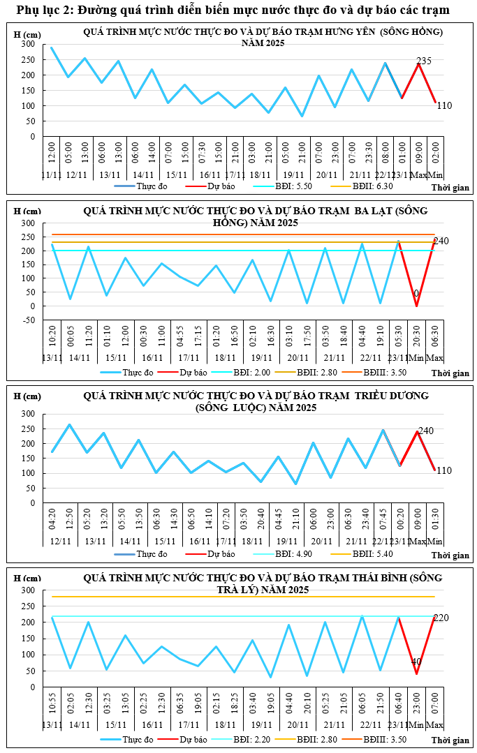 - Khả năng xuất hiện các hiện tượng thủy văn nguy hiểm trong thời hạn dự báo: Trong khoảng 24h tới, mực nước đỉnh triều trạm Ba Lạt, Thái Bình, Đông Quý có khả năng ở mức trên báo động I-II.