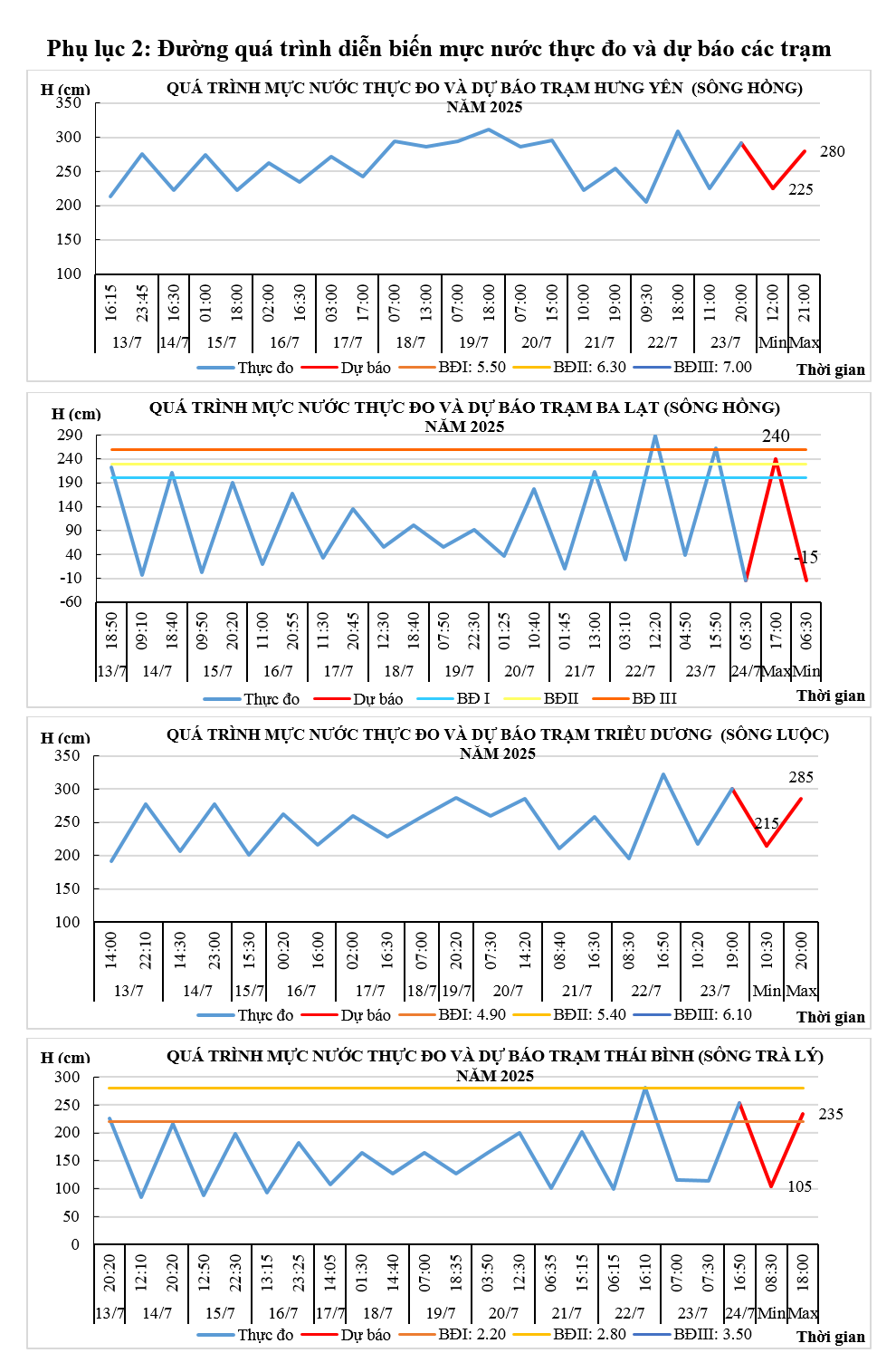 - Khả năng xuất hiện các hiện tượng thủy văn nguy hiểm trong thời hạn dự báo: Ngày 24/7 mực nước đỉnh triều trạm Ba Lạt, Thái Bình, Đông Quý có khả năng đạt trên mức báo động I - II.