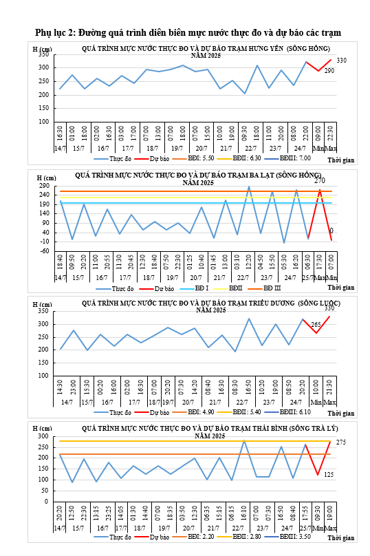 - Khả năng xuất hiện các hiện tượng thủy văn nguy hiểm trong thời hạn dự báo: Ngày 25/7 mực nước đỉnh triều trạm Ba Lạt, Thái Bình, Đông Quý có khả năng đạt trên mức báo động I - III.