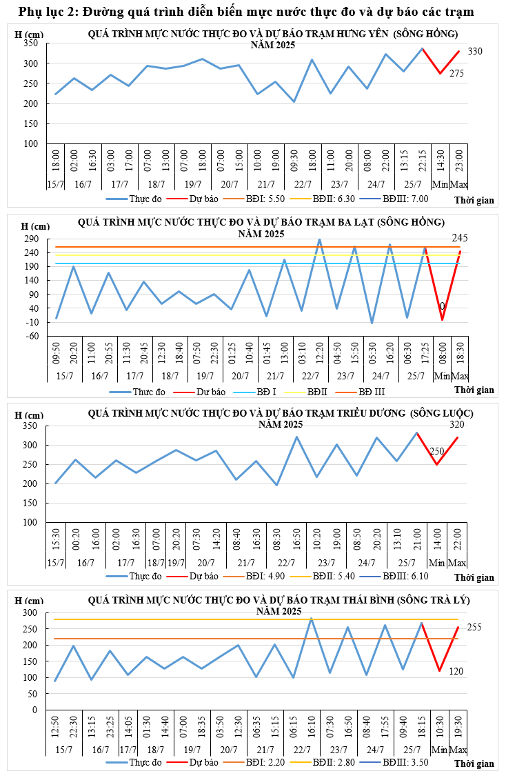 - Khả năng xuất hiện các hiện tượng thủy văn nguy hiểm trong thời hạn dự báo: Ngày 26/7 mực nước đỉnh triều trạm Ba Lạt, Thái Bình, Đông Quý có khả năng đạt trên mức báo động I - II.