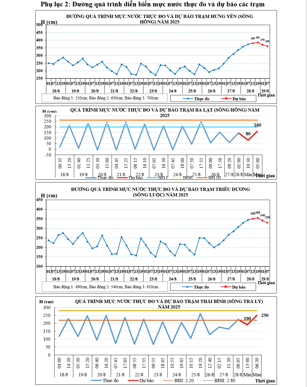 Mực nước trên các sông Hồng, sông Luộc và sông Trà Lý chịu ảnh hưởng của thủy triều, điều tiết của các hồ thủy điện: Mực nước các trạm Hưng Yên, Tiến Đức, Triều Dương, Quyết Chiến tiếp tục lên sau xuống; trạm Thái Bình, Đông Quý, Ba Lạt biến đổi chậm.