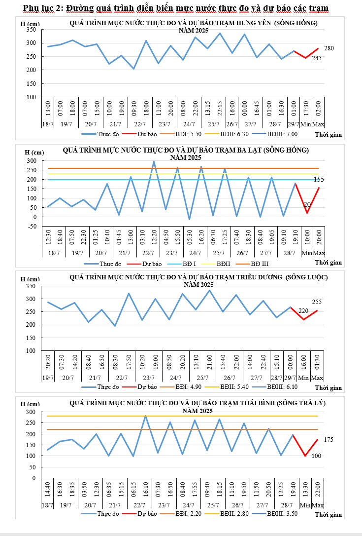 - Mực nước trên các sông Hồng, sông Luộc và sông Trà Lý chịu ảnh hưởng của thủy triều và điều tiết của các hồ thủy điện: xu thế xuống.