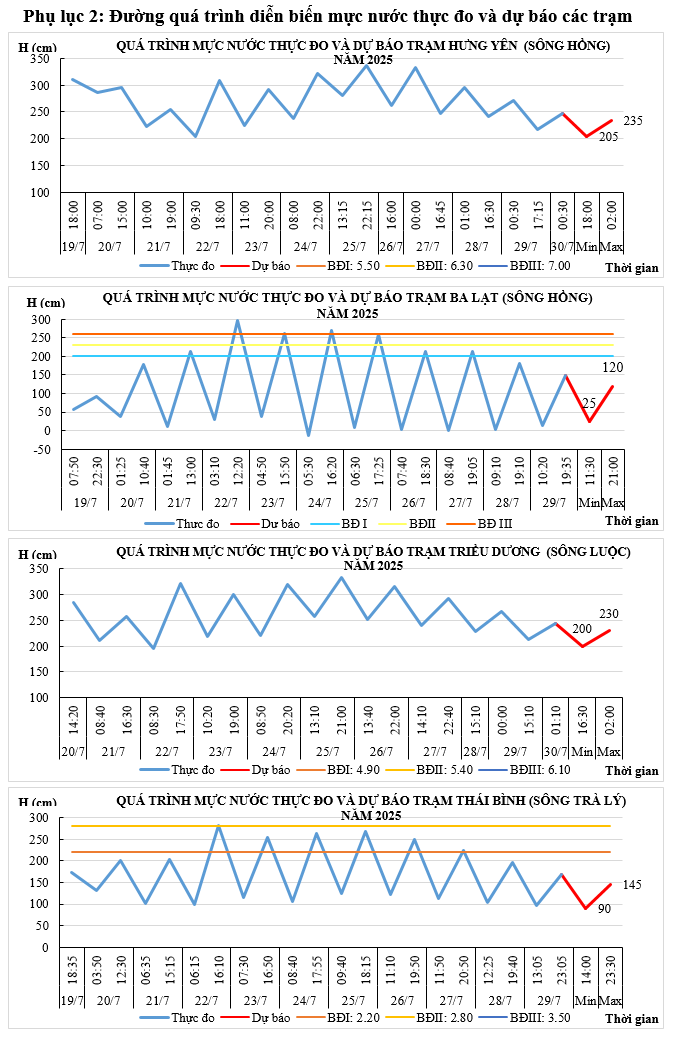 - Mực nước trên các sông Hồng, sông Luộc và sông Trà Lý chịu ảnh hưởng của thủy triều và điều tiết của các hồ thủy điện: xu thế xuống.