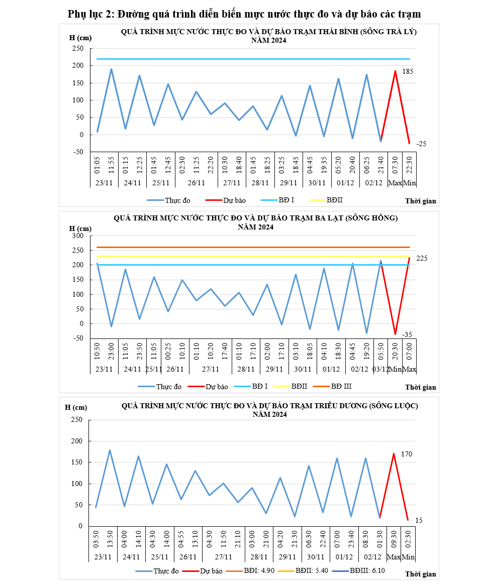 - Khả năng xuất hiện các hiện tượng thủy văn nguy hiểm trong thời hạn dự báo: Ngày 04/12 mực nước đỉnh triều trạm Ba Lạt có khả năng đạt trên báo động I.