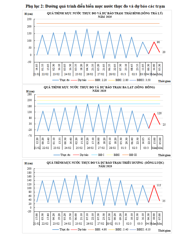 - Mực nước trên các sông Trà Lý, sông Hồng, sông Luộc chịu ảnh hưởng của thủy triều, điều tiết hồ thủy điện: Biến đổi chậm.