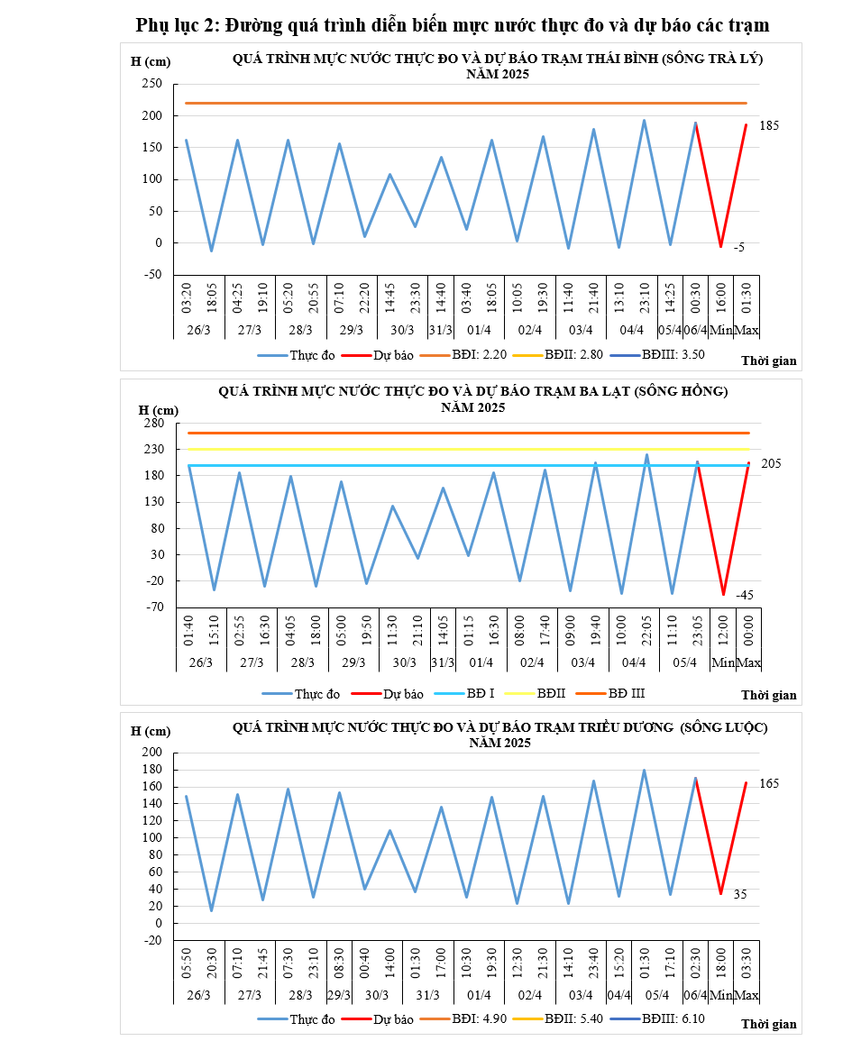 - Mực nước trên các sông Trà Lý, sông Hồng, sông Luộc chịu ảnh hưởng của thủy triều, điều tiết hồ thủy điện: biến đổi chậm.