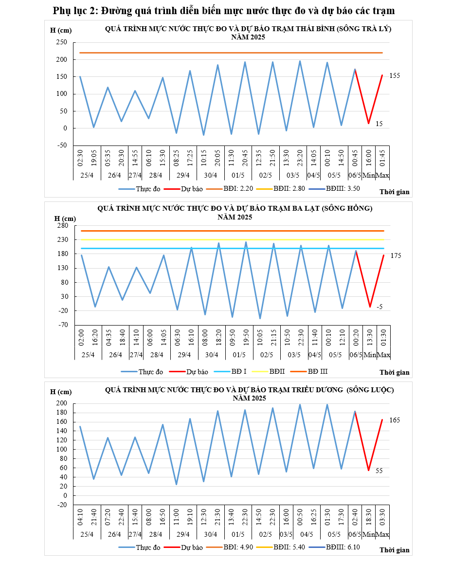 - Mực nước trên các sông Trà Lý, sông Hồng, sông Luộc chịu ảnh hưởng của thủy triều, điều tiết hồ thủy điện: xu thế xuống.