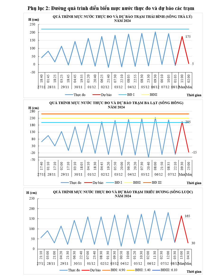 - Khả năng xuất hiện các hiện tượng thủy văn nguy hiểm trong thời hạn dự báo: Ngày 08/12 mực nước đỉnh triều trạm Ba Lạt có khả năng đạt báo động I