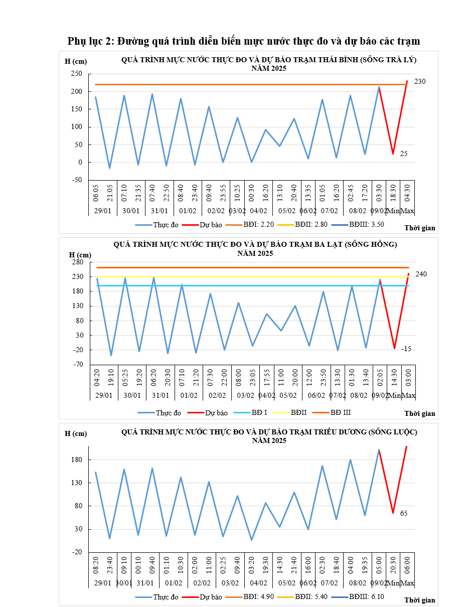 Mực nước trên sông Trà Lý, sông Hồng và sông Luộc dao động theo thủy triều, điều tiết hồ thủy điện xả nước đổ ải đợt II: mực nước các trạm tăng lên.