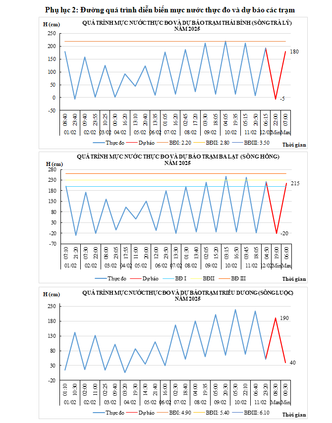 - Khả năng xuất hiện các hiện tượng thủy văn nguy hiểm trong thời hạn dự báo: Ngày 13/02 mực nước đỉnh triều trạm Ba Lạt có khả năng đạt trên báo động I.