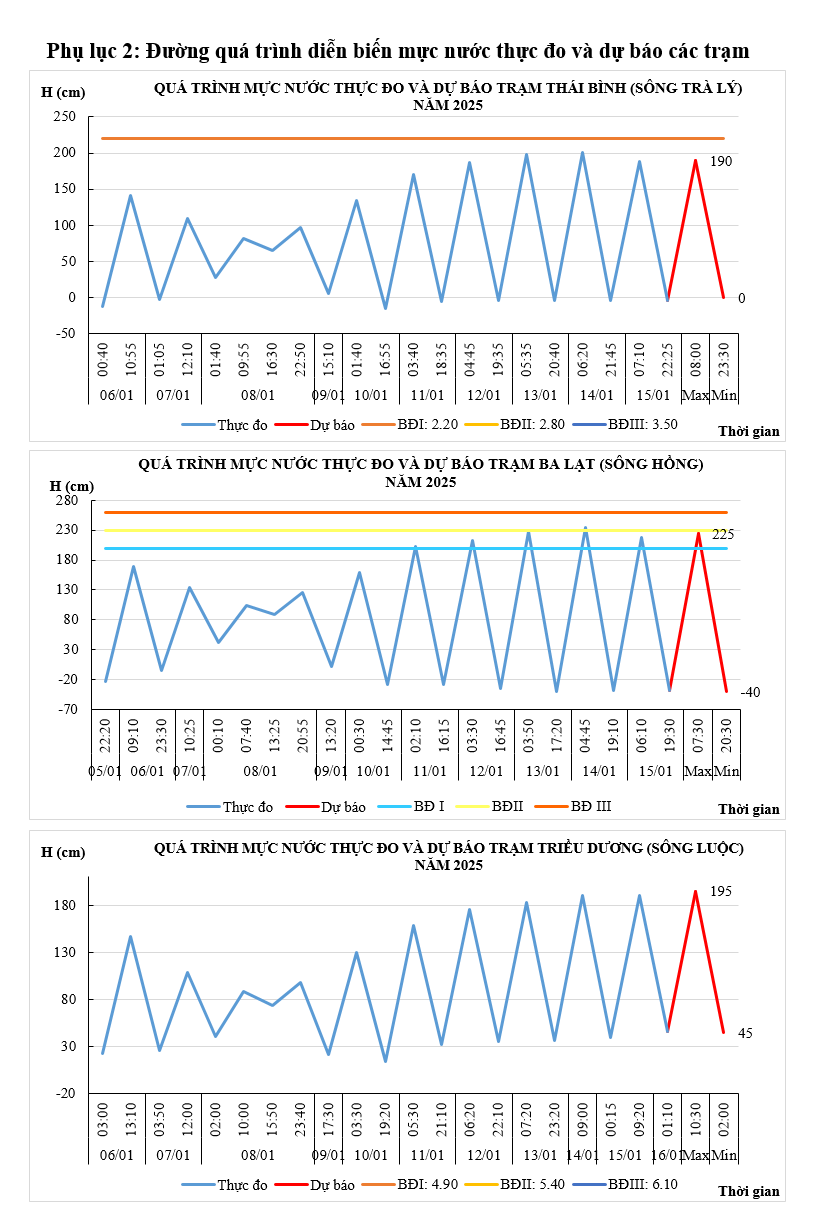 - Mực nước trên các sông Trà Lý, sông Hồng, sông Luộc chịu ảnh hưởng của thủy triều, điều tiết hồ thủy điện: Biến đổi chậm.
